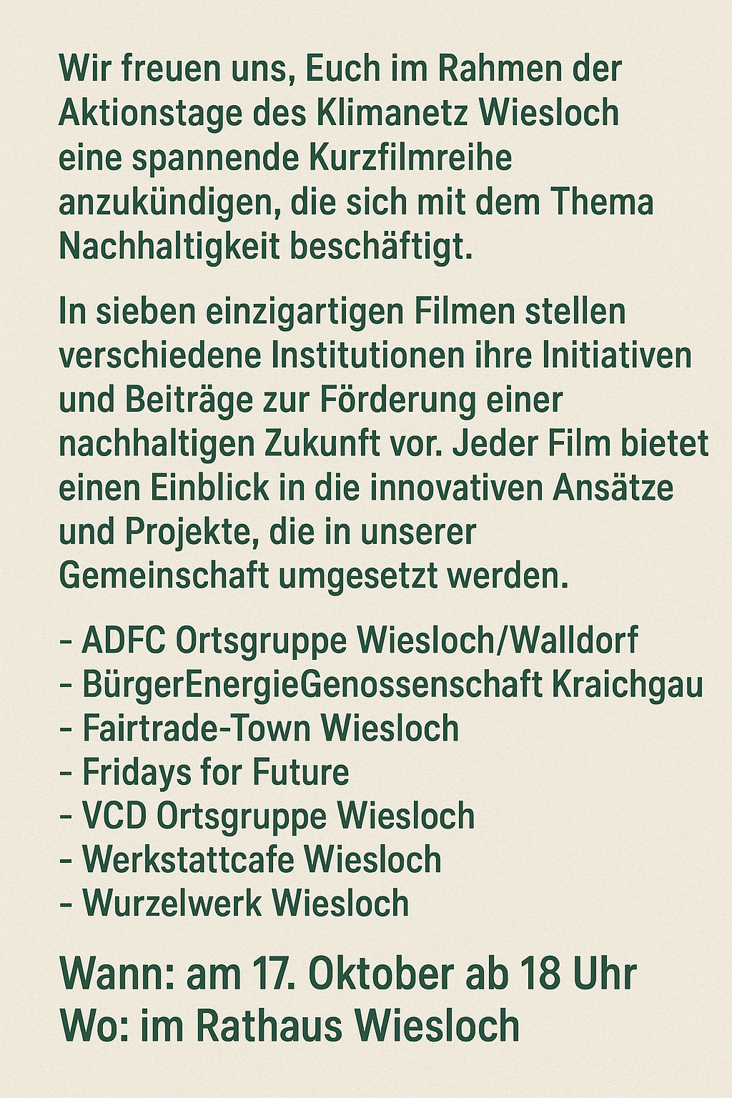 Von Gerald Gräupner / 9. Oktober 2025 Filmvorführung mit sieben Kurzfilmen über Vereine des Klimanetz Wiesloch